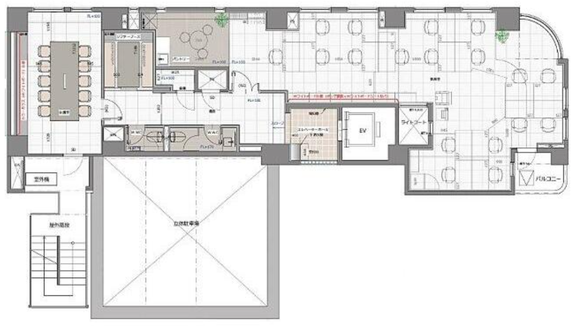 シンプルデザインの室内で会議室などの造作がついている。