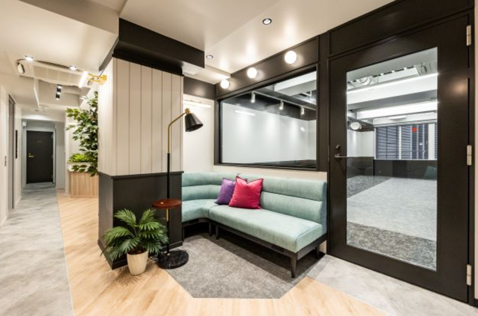 このエリアの内装付きオフィス(什器付き)6名用、4名用会議室、テレカンブース2室、ファミレスブースもあり、