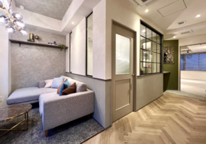 このエリアのセットアップオフィスで6名用の個室会議室とラウンジスペースが設置済み。