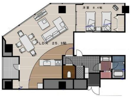 このSOHOの最大の魅力は角部屋の三面採光の大きな窓、