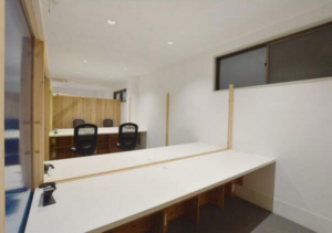 このエリアの内装付きオフィス。元シェアオフィスなので個室スペースが複数設置済み。