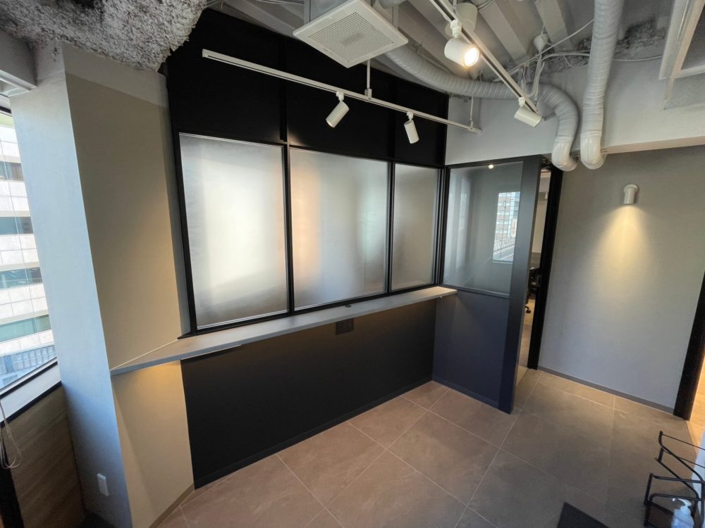 室内で、会議室やミーティングスペース、受付台まで設置。