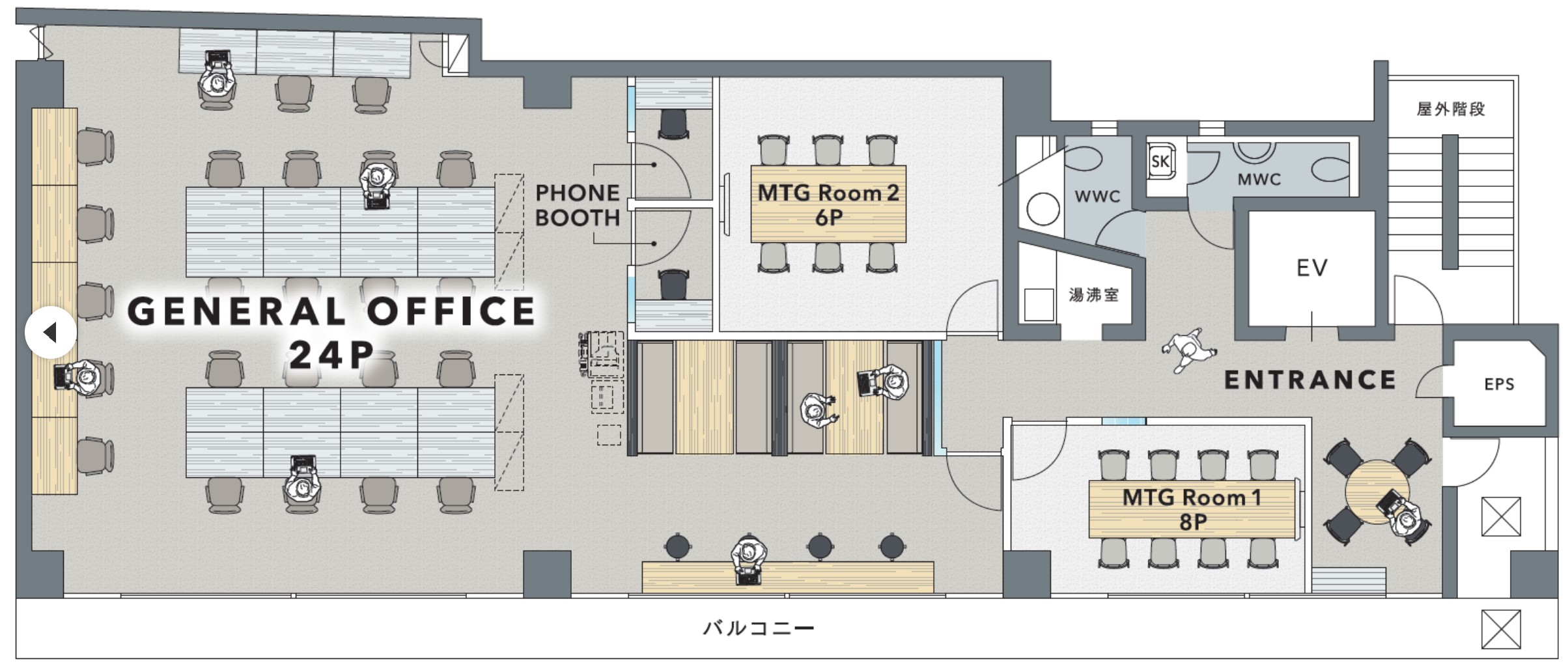 6名用と8名用の個室会議室、フォンブースが設置済みで、執務室は25-30名前後でのご利用を想定しています。
