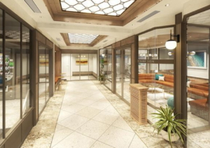 特に駅近くには小規模な居酒屋が多く、気軽に立ち寄れる雰囲気の店舗が多いことから、仕事帰りに訪れるサラリーマンが多いエリアです。このエリアのセットアップオフィスで4名用・6名用・8名用の個室会議室とラウンジ、個室ブースが設置済み。